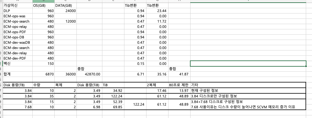 smlee 가상머신별 필요 디스크 기준으로 계산해서 공유드립니다. 여기서 확인할 부분은 2벌 복제 후 17.46TiB 가 아니라 Mold 대시보드에서는 16.41Tib로 보이는 부분에 대한 설명만 추가해서 해당 자료 전달하면 될거 같습니다.